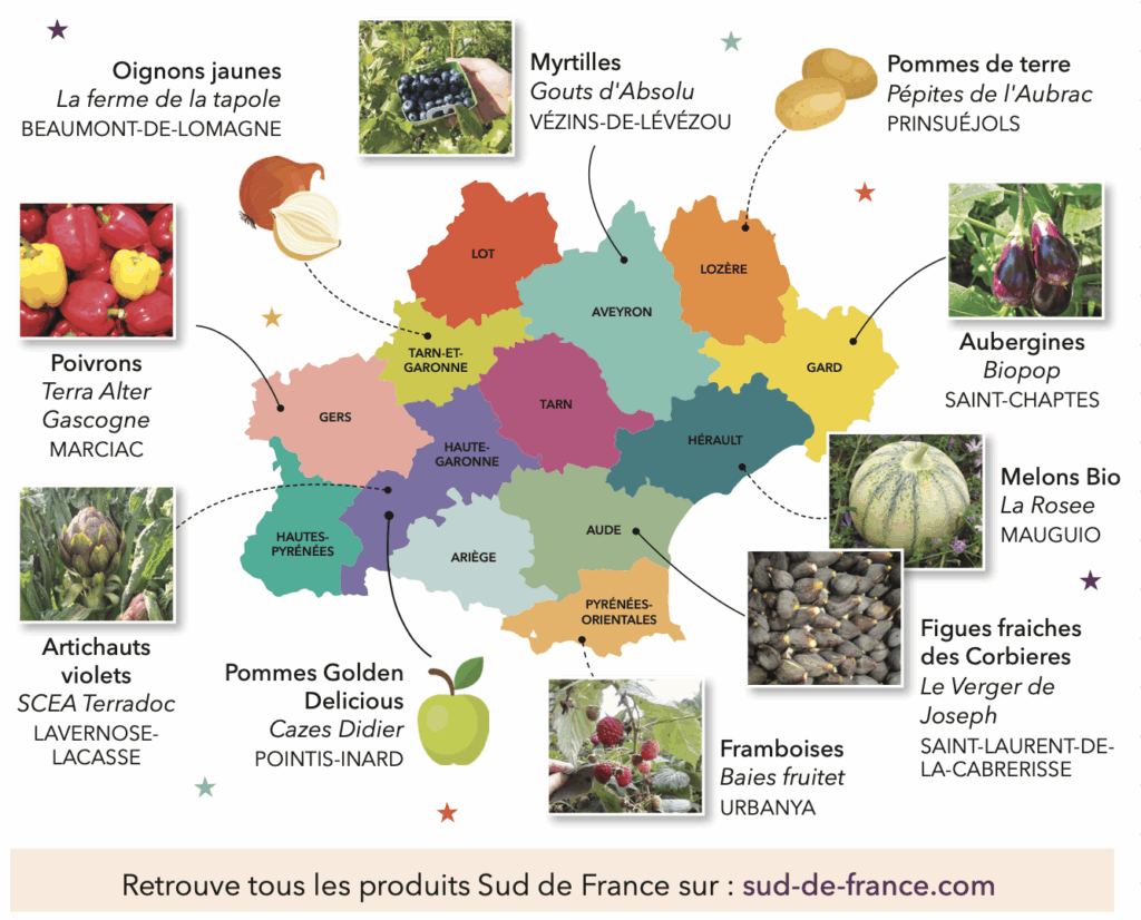 Sud de France, c’est la marque de la région Occitanie. Elle représente un signe de reconnaissance des meilleurs produits et producteurs de la région. Elle réunit des boissons, des fromages, des viandes, des produits de la mer, des plats cuisinés, des produits d’épicerie sucrée et salée… mais aussi de délicieux fruits et légumes !